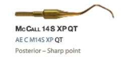 AE C M14S XP QT. McCall curette anvendes posterior. Quik-Tip spidser monteres på instrumentgreb. Fåes i forskellige udgaver: Guldfarvet eller i metal. XP= guldfarvet. Skal ikke slibes. Er skarp til det sidste. Sølvfarvet arbejdende del skal slibes.