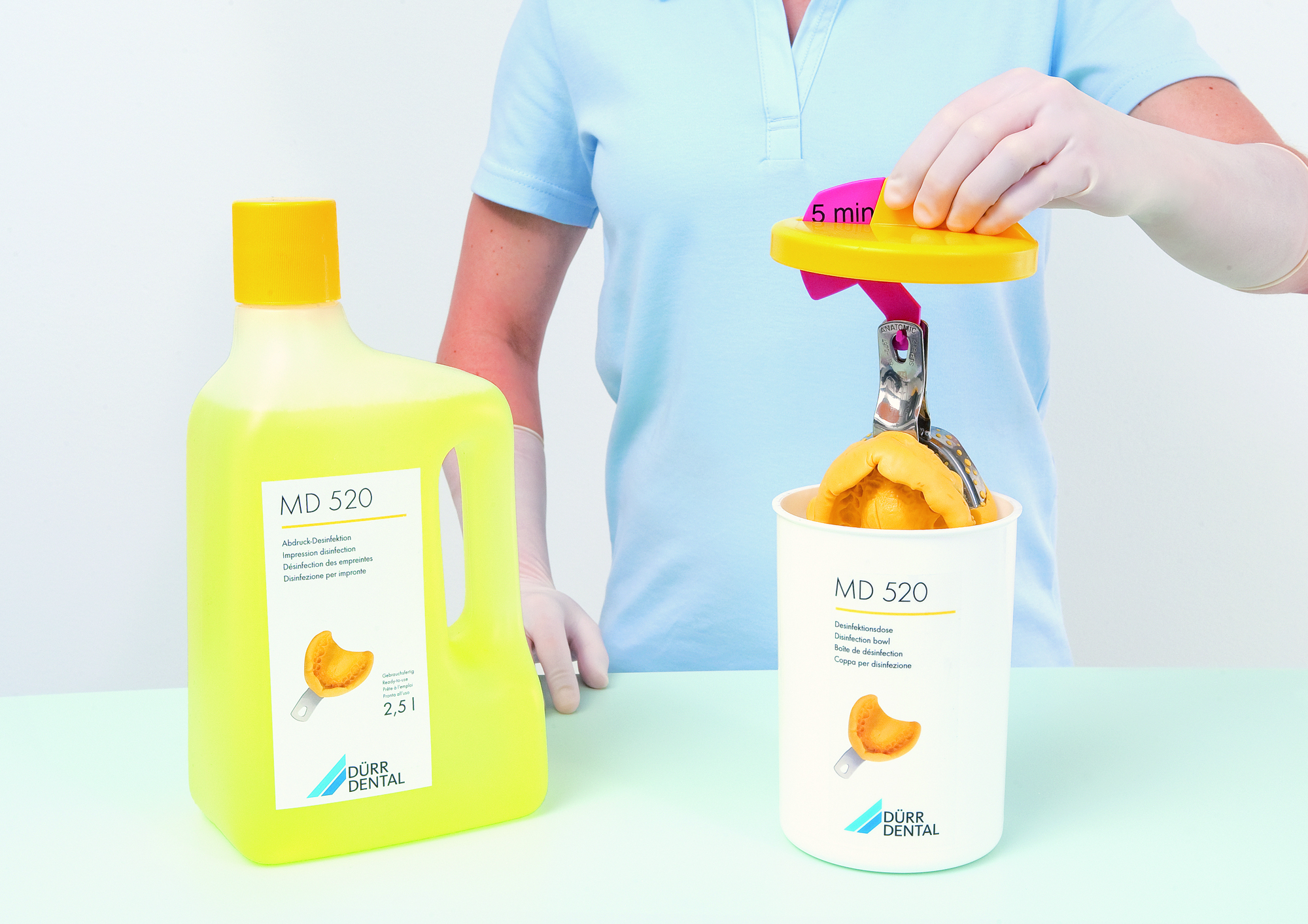 Desinfektionsbeholder med holder til 2 aftryk. Til desinfektion af aftryk med MD520 på kun 5 min. Højde 18,5 cm, diameter 11,8 cm.