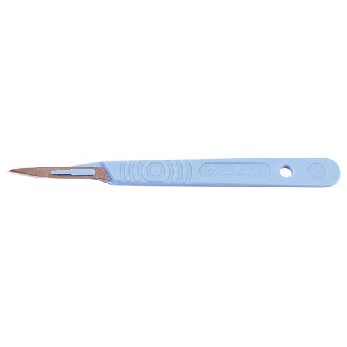 Swann-Mortom skalpelblad på blå plastskaft. Rustfrit stål. 3-dobbelt facetslibning.
