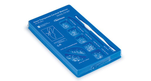 Cervicale matricer, transparente til lyshærdende kompositter. Ass. 35stk a nr 851S, 852S, 853S, 854S, 855S, 50stk a nr 856S, 857S, 1 stk gingival retractor, 1 stk holding instrument.