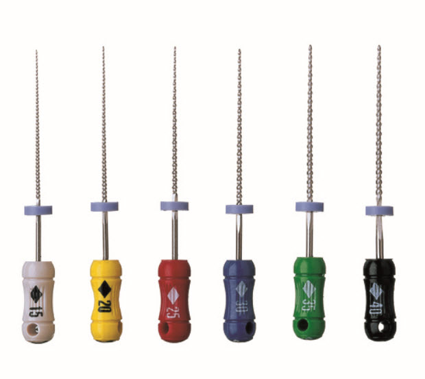 Flekible håndfile i rustfrit stål og farvekodet plastgreb.