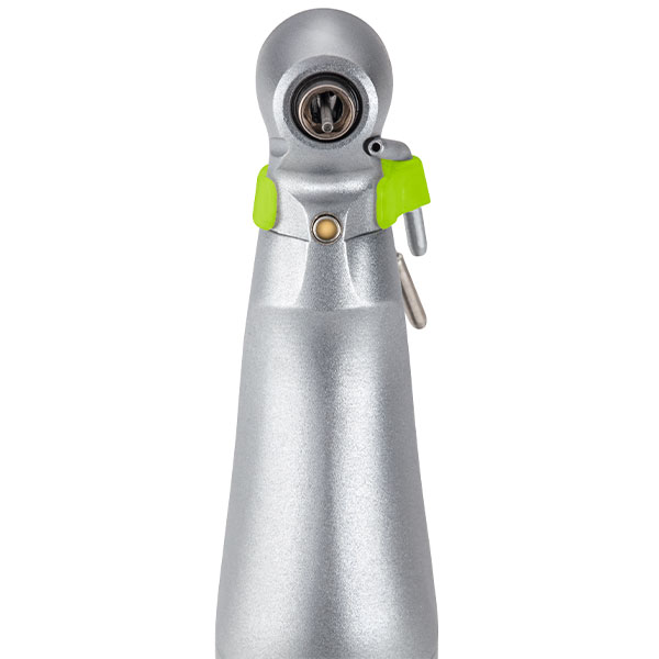 Ridsefrit vinkelstykke i rustfrit stål til kiurgi. Med LED lys og ekstern spray. Kan adskilles for optimal rengøring. RA/vinkelstykkebor anvendes heri.