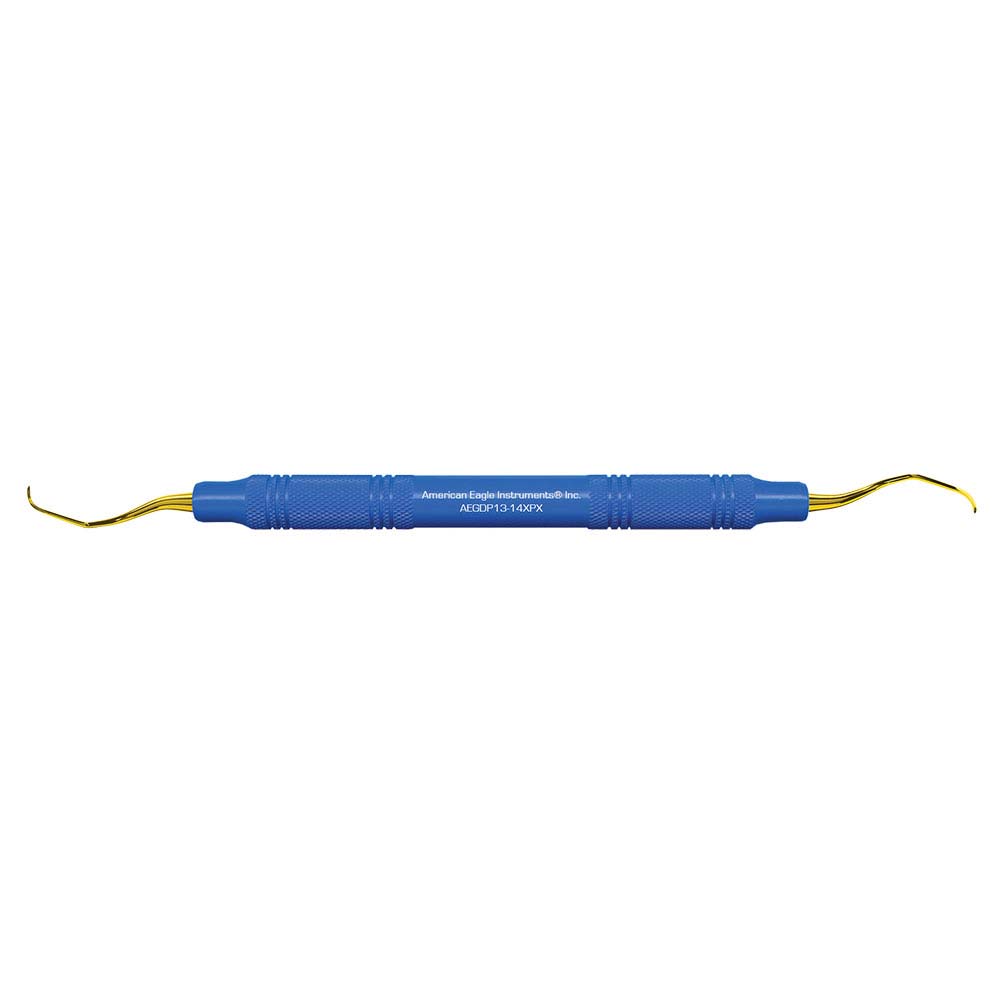 Curetten anvendes distalt på præmolar/molar i OK/UK. Deep Pocket/DP er 3mm længere end en almindelig Gracey, og er derfor velegnet til pocher på 5mm eller derover. Instrumentet kan/skal ikke slibes. Ref: AEGDP13-14XPX