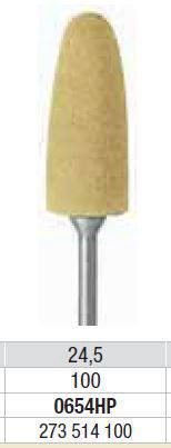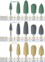 3- trins polerer system til protetisk eller ortodontisk akryl. Grøn: trin1, grov. Grå: trin 2, medium. Gul : trin 3, fin. Anvendes til at glatte overfladen. Stor konisk formet.