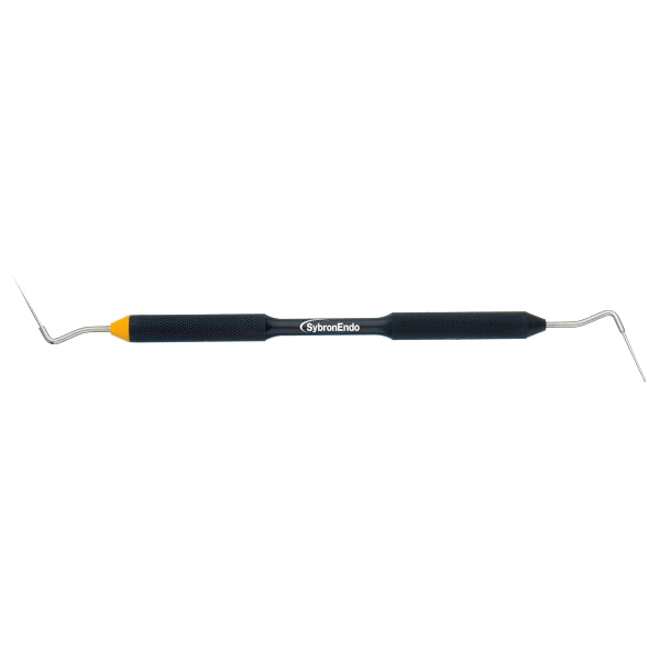 Manuel dobbeltendet rodstopper. Den gule ende er i nikkeltitanium og den anden ende er i rustfrit stål, således at intrumentet både kan anvendes til varm og kold kondensering. Rustfri ende: .02/1,2 Niti: .03/0,70